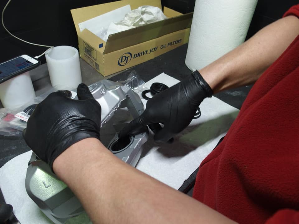 2ピースキャリパーは内部の徹底洗浄とサンドブラストメディア残りが無いように、分解点検したのち、超音速洗浄を経て、塗装前に組み立てを行います。